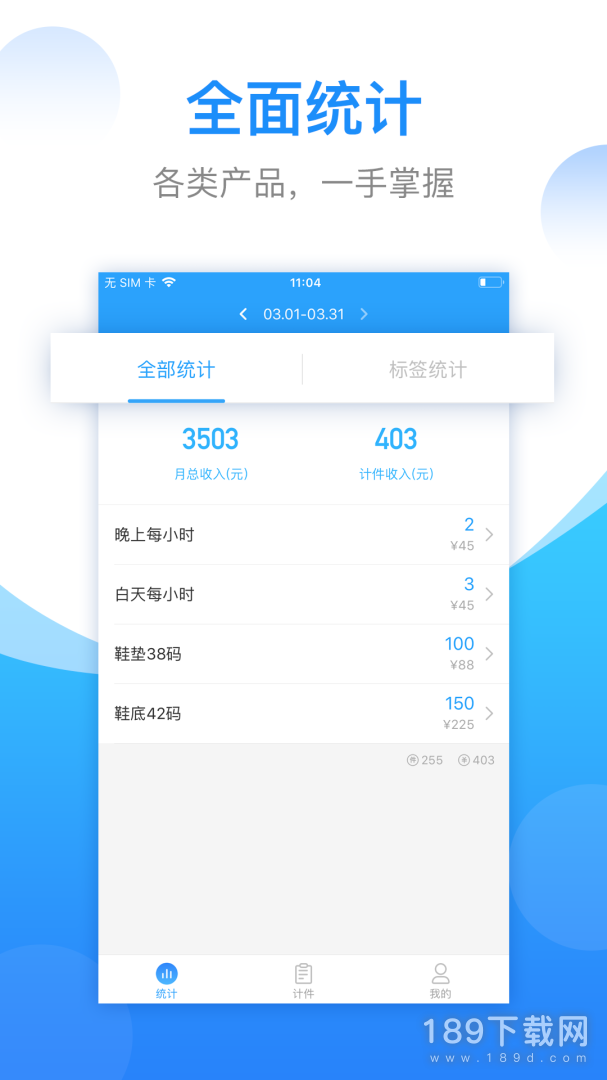 3、统计功能:靓丽的统计页面,用户可以通过饼图了解自己的收入分布。想知道自己每日每月的收入情况,统计功能可以一目了然,对自己的收入了如指掌,也不用担心单位算错记错的情况,让自己的每一分汗水和努力都能得到回报。