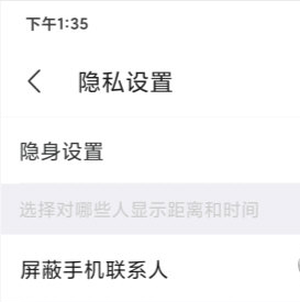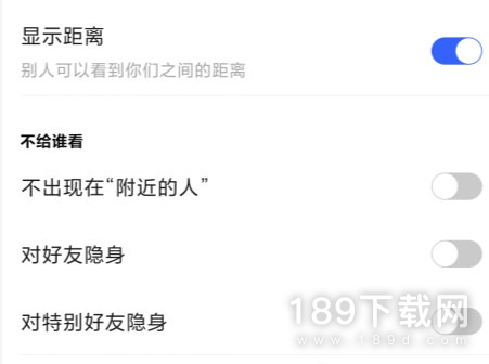 选择第一个距离隐私,点击进入,最下面有个关闭距离,对其所有人隐身。