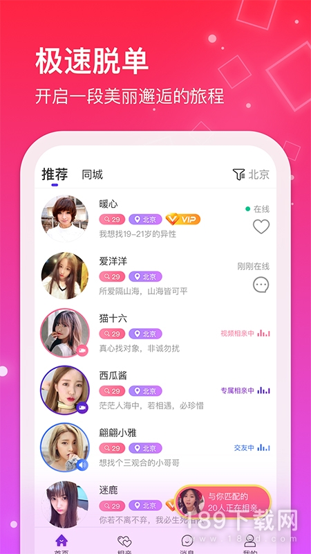 1、首页匹配附近有缘人,同城及匹配用户任你选择