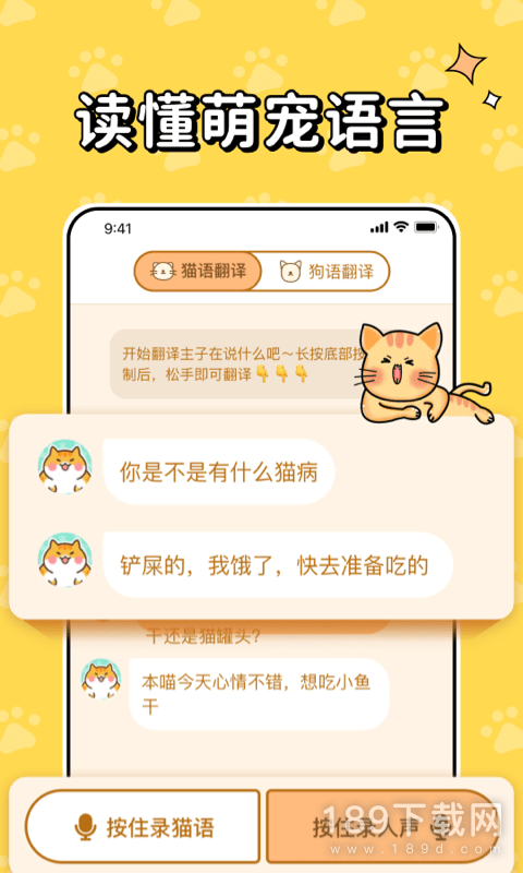 2、猫狗翻译器是一款手机宠物交流应用软件,可以翻译狗语猫语的小助手!通过音频识别宠物传达信息,也可以将人类语言转化为猫狗语言,有趣又好玩,快来下载吧