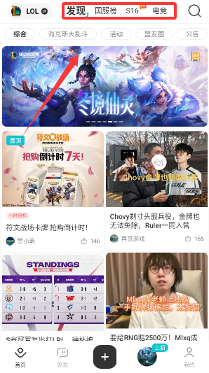 1、首先,打开掌上英雄联盟app主页,点击箭头所指的视频的位置。
