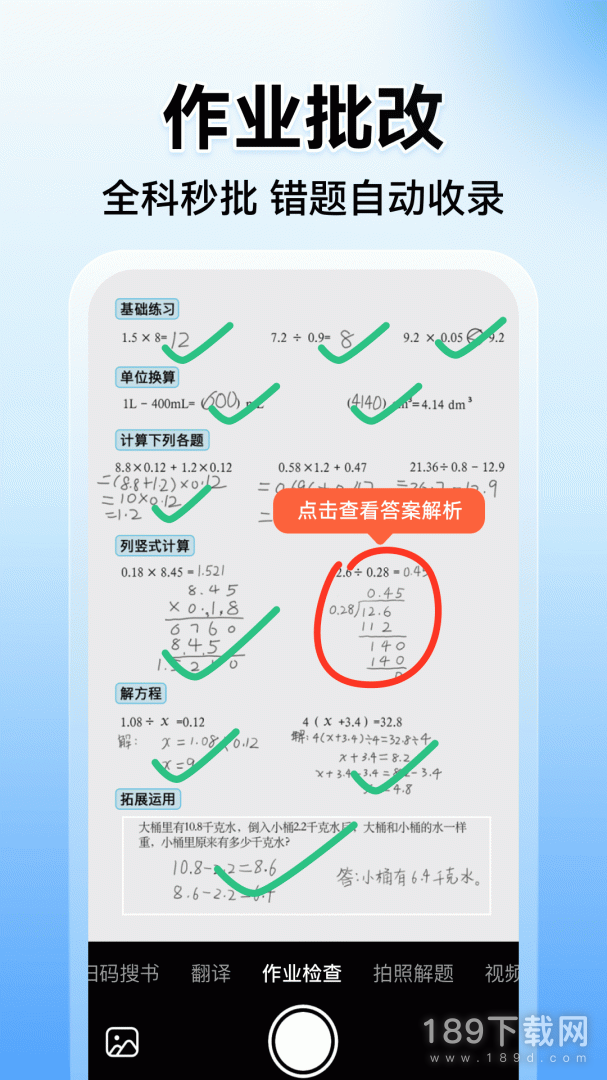 点击屏幕中央的【拍照搜题】,然后用你的摄像头对着题目拍一拍即可,记得要横屏拍照。(很遗憾小编手头没有任何作业本,所以没办法去找作业题目拍照哦)