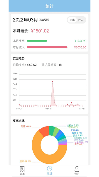 3、支出、收入智能分析报表,便于查看消费趋势,合理做出规划;