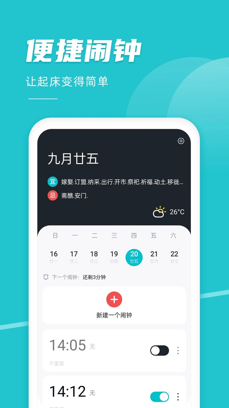 准点闹钟是一个闹钟工具,除了基本的响铃提醒外,还提供了日历工具,可以全方位的帮助用户掌握每天的日期和时间,也让用户准时起床、睡觉、上班等;相应的用户只要将该软件安装在手机中后,就可以任意的设置闹钟进行提醒,一次性即可管理多个闹钟,而系统就会根据用户的设置准时提醒,让用户及时了解需要完成的事项,同时基于此功能上,用户可以任意的创建不同类型的闹钟,并满足了多样化的生活需求,也适应了各种生活场景;所以,想要准时办事的用户,赶快来下载该软件进行体验,让你及时掌握时间,避免错过事项。