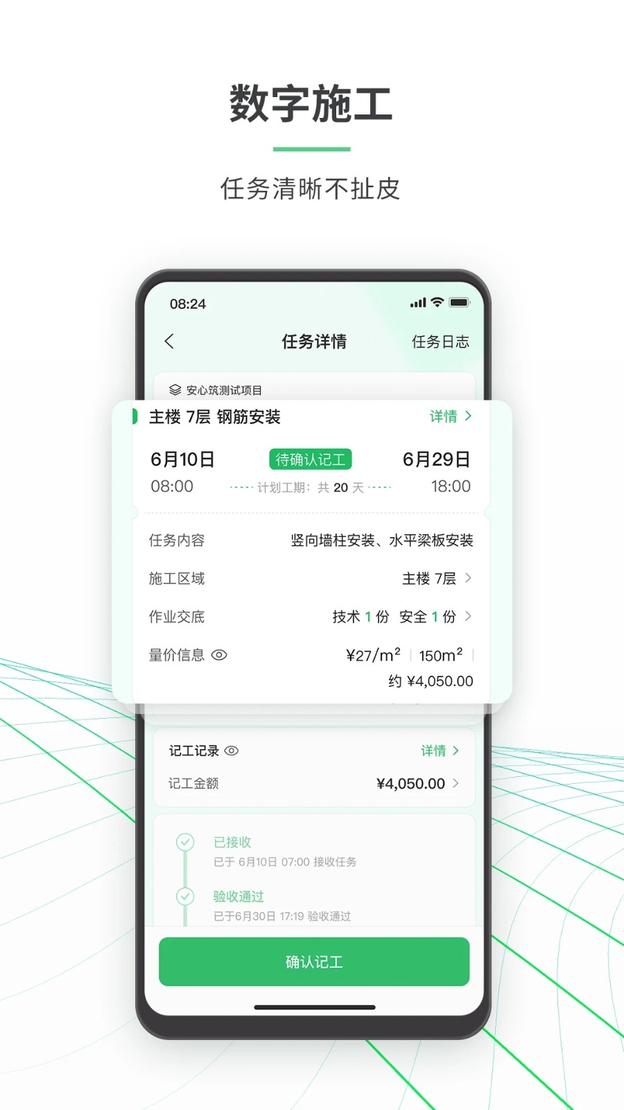 任务管理:班组长可通过APP线上分发任务,工人接收任务并确认记工。任务创建一体,施工链完整明确,确保施工过程透明可追溯。