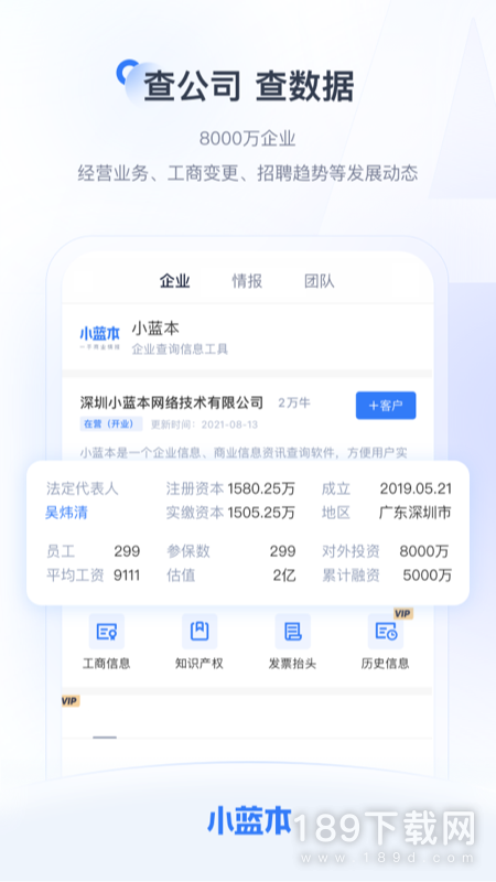 1、小蓝本是一款非常实用的企业查询软件,用户下载app可以实时查看企业组织结构和企业状况,掌握商业信息,了解企业背景,有需要的用户赶快来下载吧