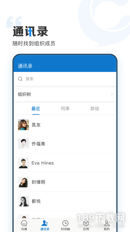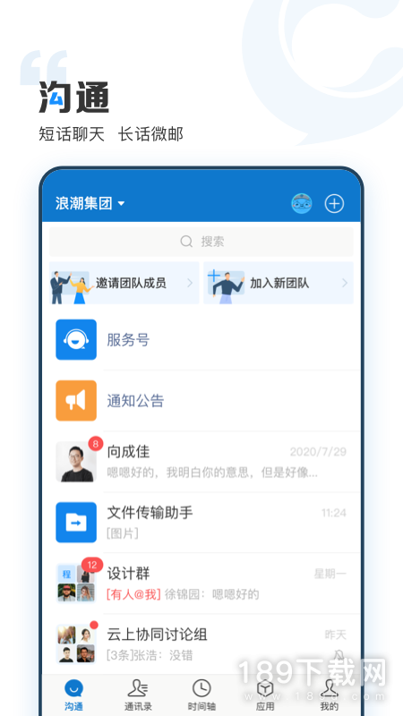 5、云上协同是一款效率办公软件,云上协同中包含“沟通”、 “时间轴”、“通讯录”、“应用”、“我”五个模块