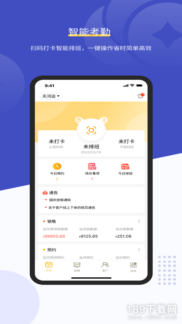 3、一款非常适合企业的办公管理应用。有智能考勤报告和客户管理系统