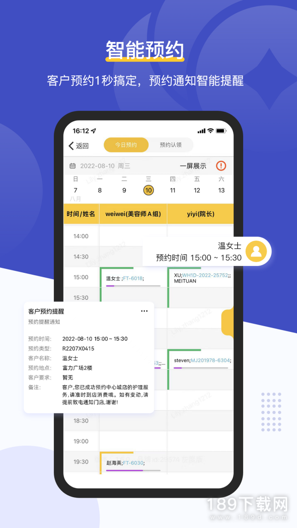 4、美克拉员工是针对所有美业实体店人员来进行使用吧,直接下载注册就可以使用了,能够轻松的了解到所有人的预约情况,查询到自己排版、考勤、业绩等等不同,通过app轻松的管理日常工作吧