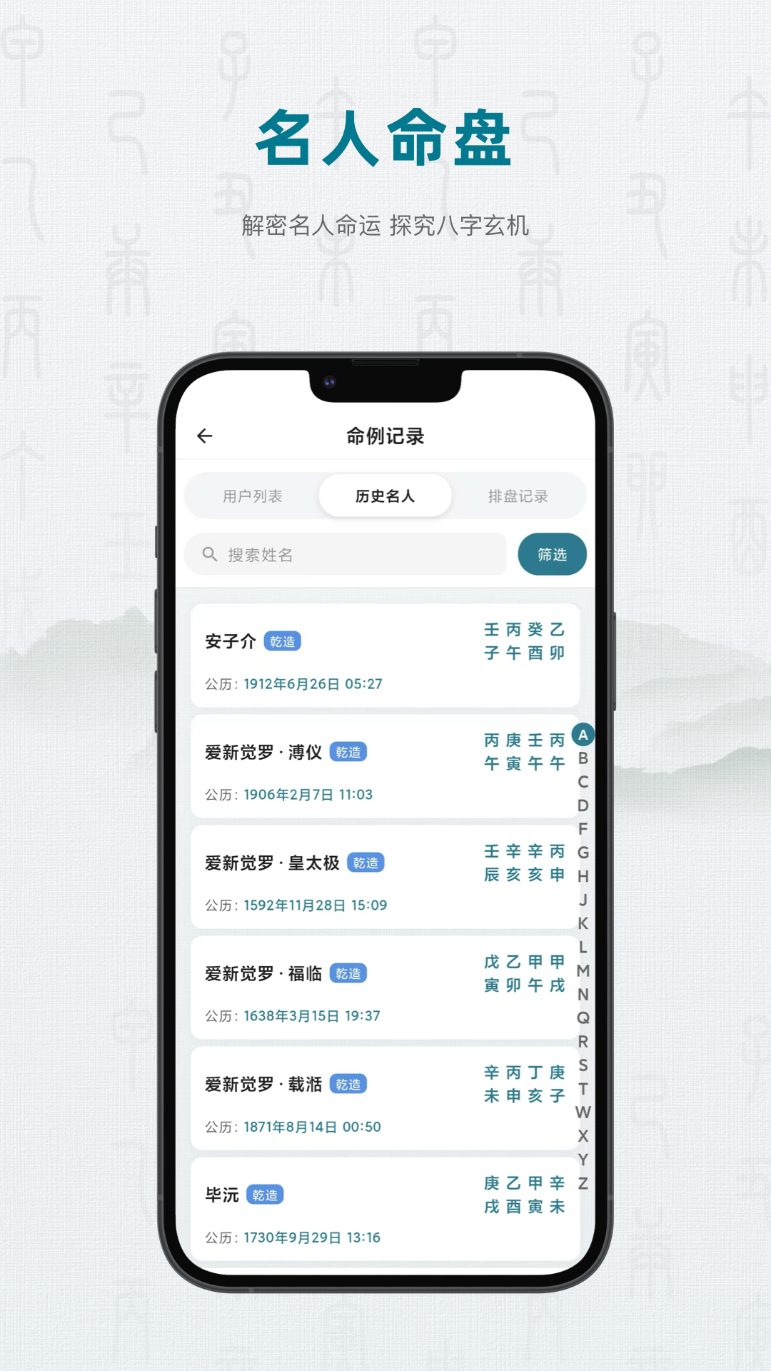 历史名人:搜索框输入名字,查看其命局特点(适合学习研究)。