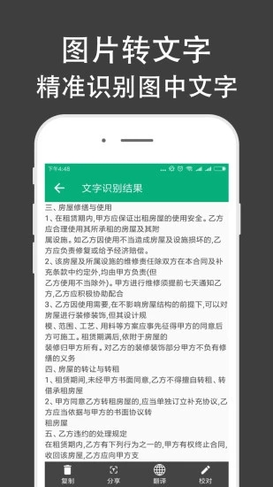 该APP具备强大的OCR文字识别功能,能准确识别图片中的文字,支持中文、英文、法语等多重语言,并免费校对识别后的文字,方便用户进行复制、分享或保存为txt文本。
