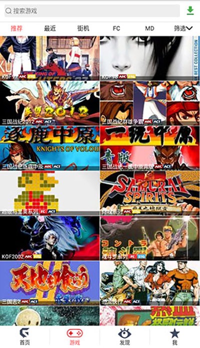 2、进入首页后界面如下,可以看到各类游戏,如:街机游戏、fc游戏、md游戏等等;