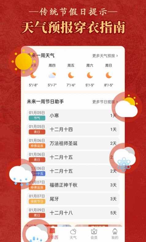 然后首页会显示当日公历、农历日期、宜忌事项、天气预报等基础信息。