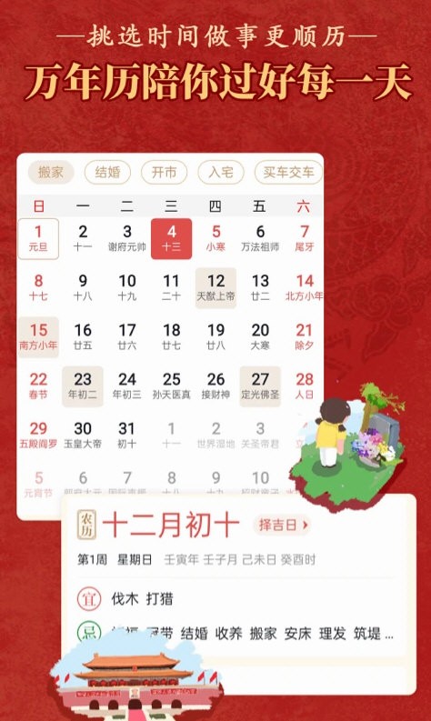 老黄历万年历顺历APP是一款基于中国传统历法与民俗文化打造的生活服务类应用,以传承中华文化为核心,将古老的黄历智慧与现代生活需求相结合。软件以顺应天时,指导生活为理念,为用户提供权威的黄历查询、民俗解读、生活指南等服务。不同于普通日历工具,APP深度挖掘传统历法中的时间哲学,结合现代用户的使用场景,打造出兼具文化底蕴与实用价值的数字黄历平台。