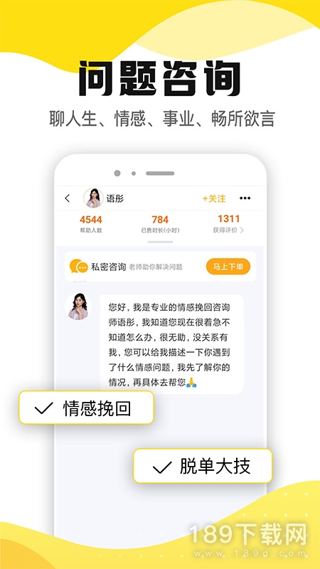 2、听芝心理app一款很不错的情感类软件,解决你心中的困惑,情感老师在线一对一解答,修复你的情感创伤,软件还可以算命,八卦,起名等等,一对一互动,需要的用户欢迎来点击下载