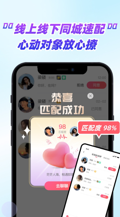 3、同城匹配,同城聊天,同城约会,时下单身男女追求的聊天约会场景。