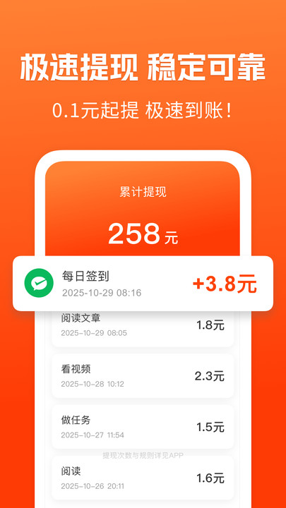 4、提现到账速度极快,让用户能迅速获得收益反馈,增强使用信心与粘性。