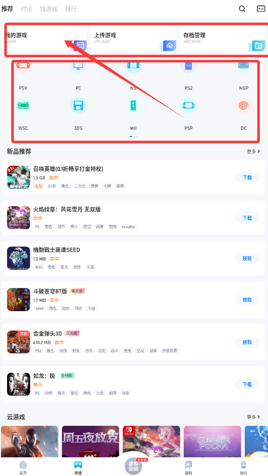 3、软件还集成了多平台模拟器支持,图标区展示了PSP、3DS、PS2等众多主机标志,意味着能够在移动设备上体验这些平台的经典游戏,并伴有社区讨论与存档服务。
