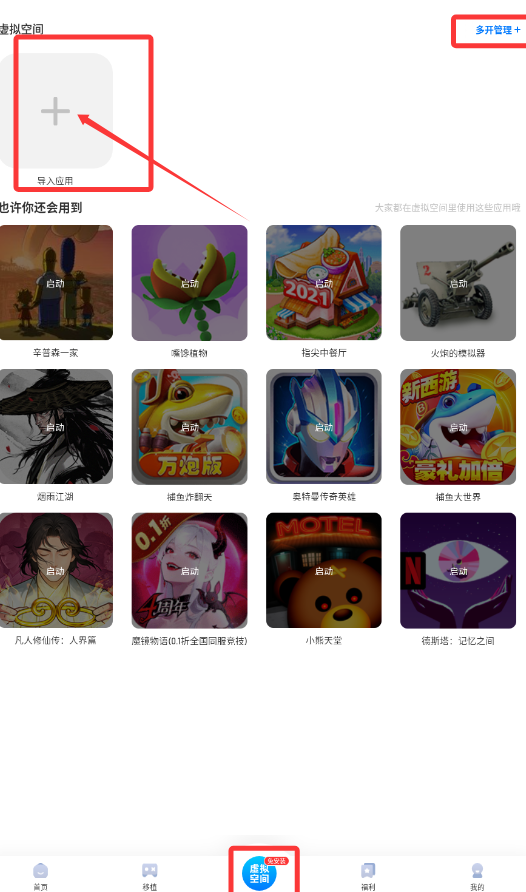 2、软件核心功能之一是“虚拟空间”,可通过“导入应用”将移动端游戏装入其中,实现多开或隔离运行,下方还推荐了多款如《海燕江湖》、《捕鱼炸翻天》等热门游戏便于直接体验。