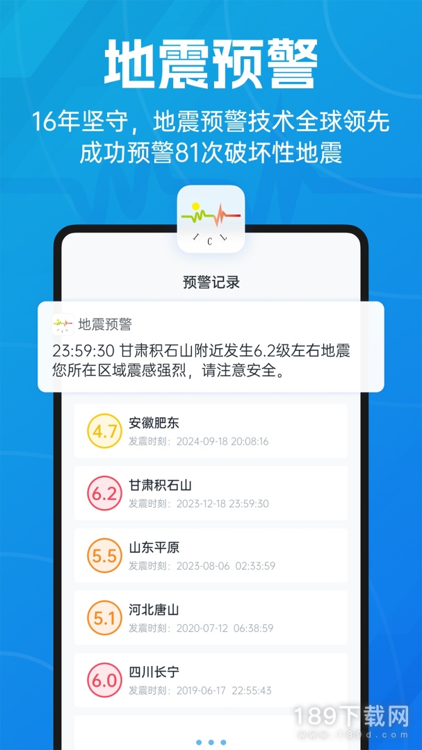3、为您提供便捷的发震时间,地点,余震时间,震级预警,震感强度等等