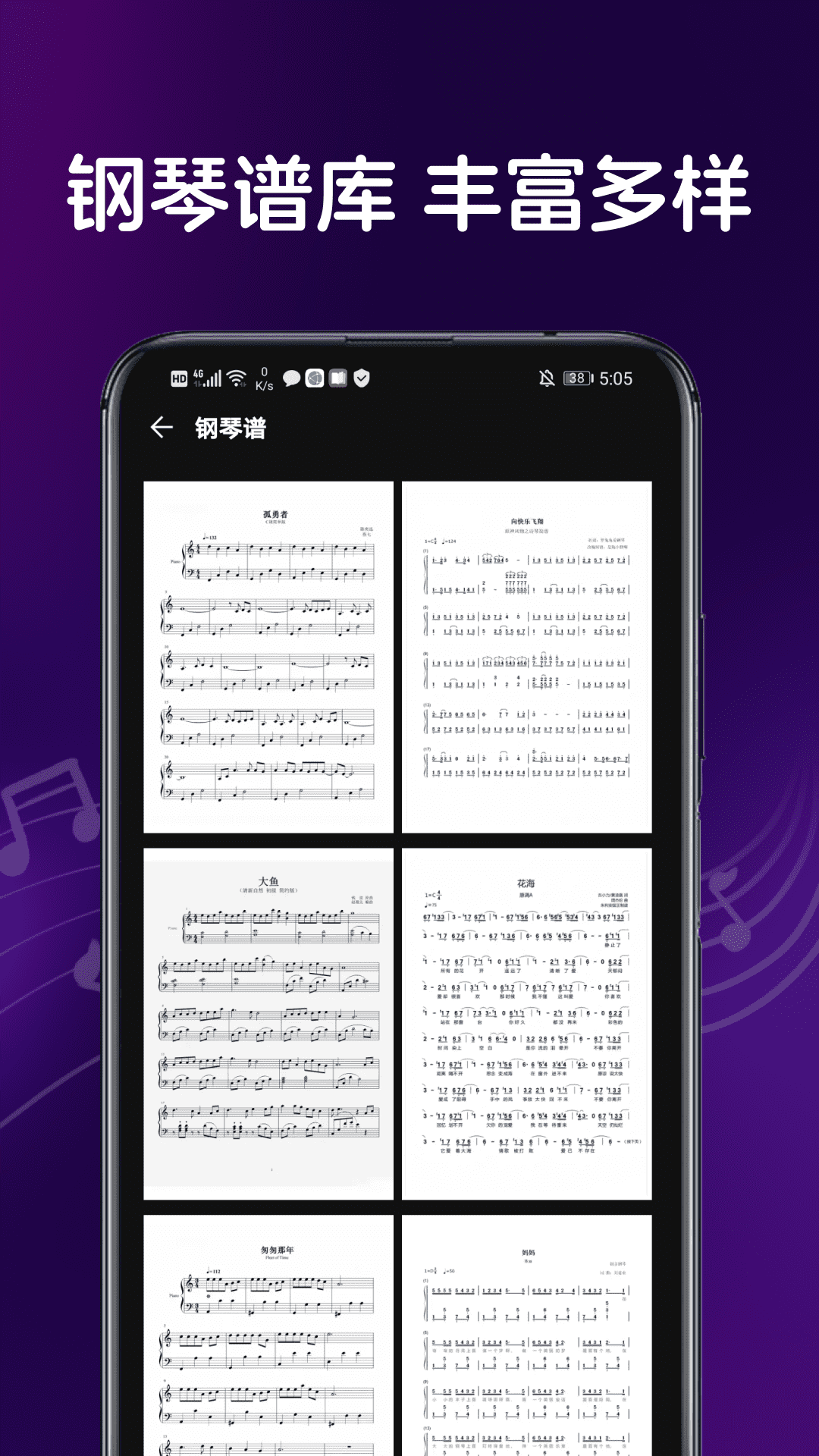2、查阅钢琴曲谱,平台集成海量经典钢琴曲谱库,支持按曲目、难度或风格查找,方便练习时使用。