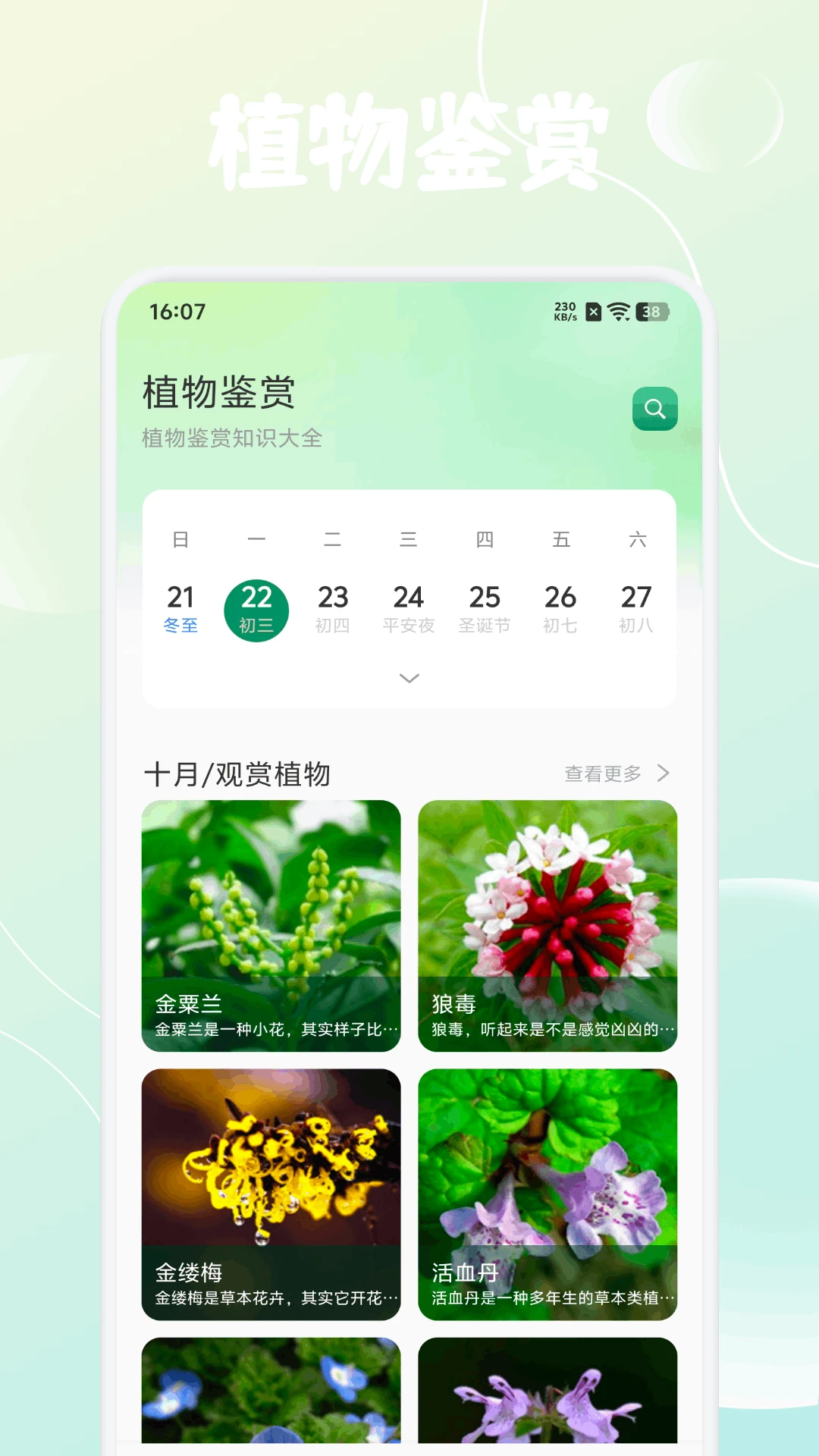 1、 用户可浏览高清植物图片库,点击进入详情页,查看学名、科属、习性、花期等全方位的植物档案。