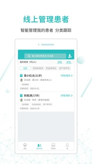 2、在我的用户页面,这里会为我们记录记录所有服务过的患者,我们可以在这里对用户和患者进行随访调查,同时也能收到来自它们的消息,当然右上角还为我们提供了屏蔽和群发功能。