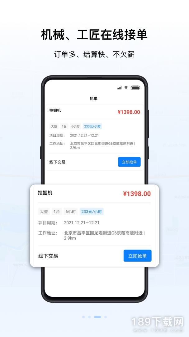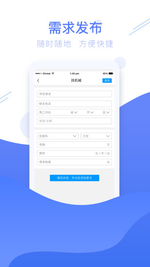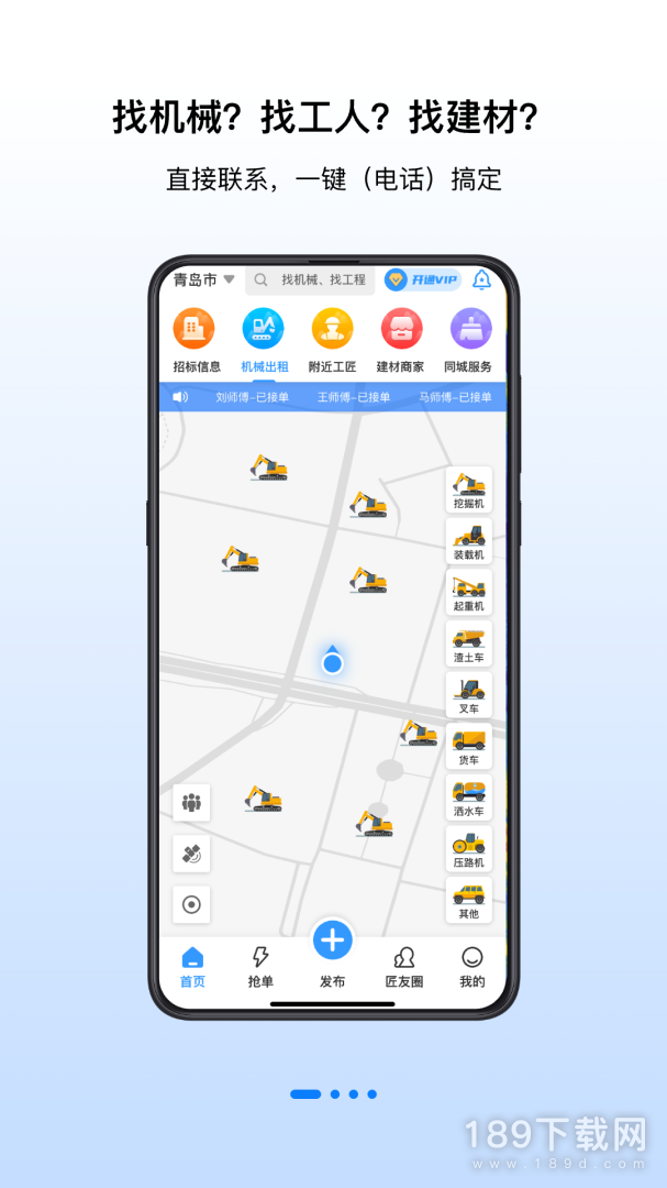 5、前已具备智能寻找工程车辆、发布工程车辆的需求订单、让所有工程车辆的车主们足不出户通过互联网接单
