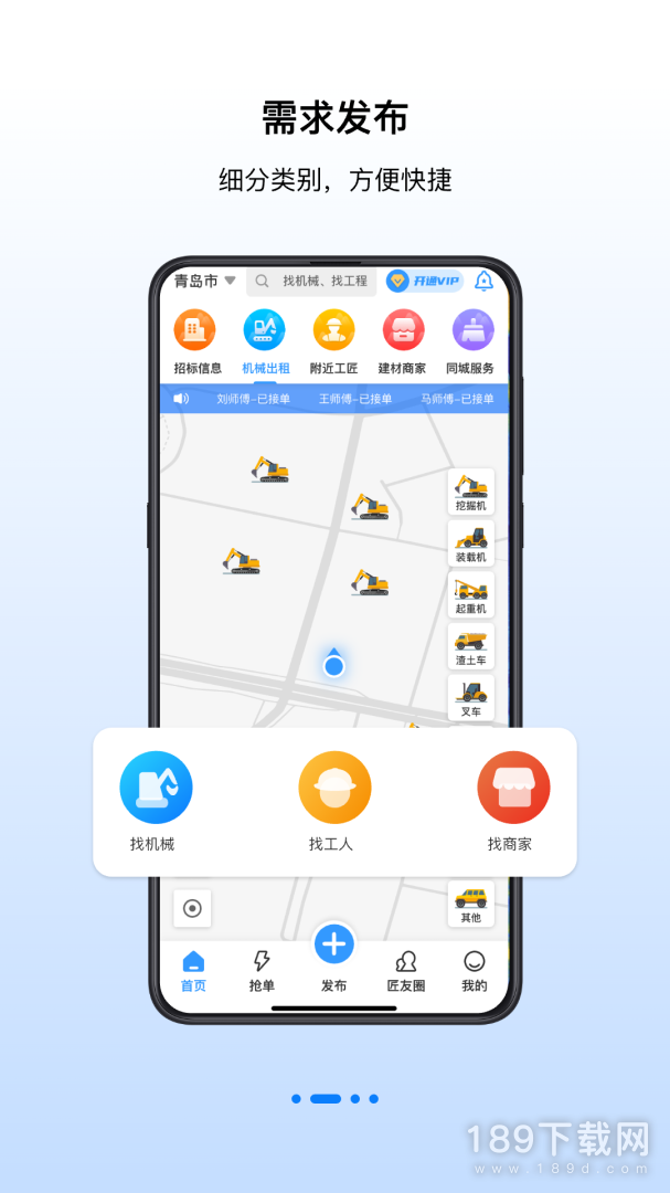 用户可以随时随地发布找机械、找工人、找建材需求,平台能够快速推送给车主、工人和商家,车主、工人和商家足不出户就可以接单,并和用户实时沟通,及时确认订单;企业可以随时随地发布工程发包需求,平台准确快速推送给订阅用户;匠人学堂为广大工匠人提供专业学习资料,邀请专家教授讲课,每时每刻,想学就学。