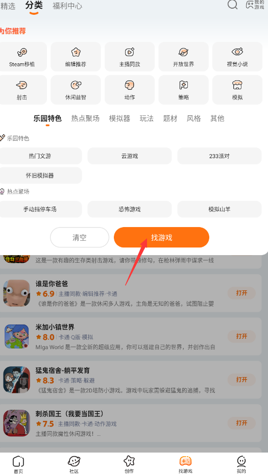 2.想找特定类型的游戏,可以点击“找游戏”页面。
