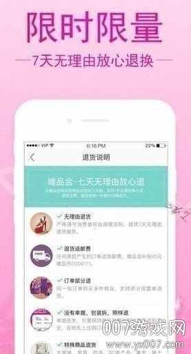 7天无理由退货,自营商品免费上门收件(自行寄回返10元唯品币);