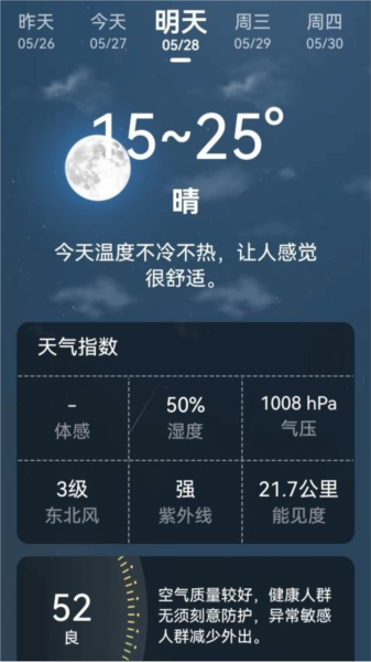 打开APP后,首页通常会显示当前城市的实时天气预报,包括温度、湿度、风速、空气质量等信息。用户可以通过滑动屏幕查看更多天气详情,如未来几天的天气趋势、降水概率等。