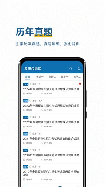 考研必题库是一款为用户提供考研学习的软件,其中包含了专业的考研课程进行学习,用户根据自己的专业情况,选择具体的内容进行详细的学习,帮助用户高效备考,轻松上岸,提供各个科目的专项练习题目进行选择,用户在学习课本知识后,可以选择课后的练习进行巩固学习,反复加深知识的印象,还提供了历年真题进行学习,帮助用户掌握必考的题型和出题规律,帮助用户快速上岸。这里助力于每一位考生考题练习,不仅有真题练习还有模拟题练习,更有试卷模拟,还有考题详情,帮助考生能更好的做题、改题、理解题,助力考生成功上岸考上自己理想的学校。