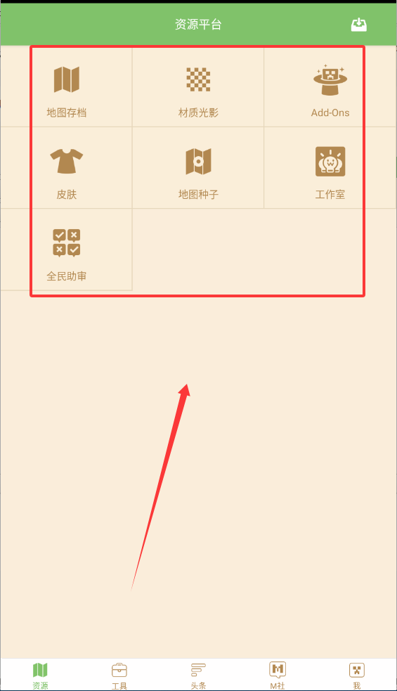 1 、启动应用后即可见到主界面布局,上方以绿色长条醒目标注名称,下方则采用九宫格样式将地图存档、材质光影等多个功能模块有序排列。