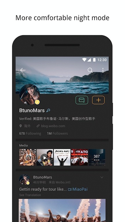 微博国际版APP是一款来自新浪推出的手机社交应用。在这个版本里面会让你有种不一样的感觉,你会发现里面的界面变得更加清爽了,没有任何多余的广告模块,不过里面的其他社交功能还是很完整的,一起来随时随地发现自己身边的新鲜事情吧。并且微博国际版充分发挥了微博的社交资讯属性,大家可以在这里搜索热门视频以及热门微博,以及支持夜间模式和一键翻译,很好的满足了用户的使用兴趣,感兴趣的小伙伴快来下载使用吧!