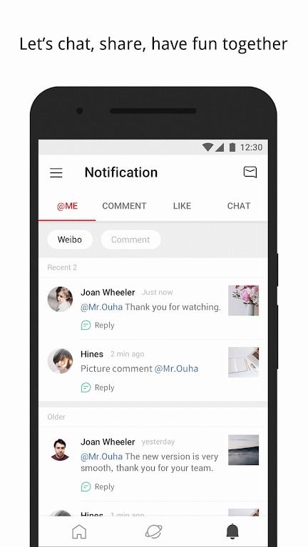 7、消息通知:@我的、评论、赞、私信模块区分更方便易读,互不干扰。