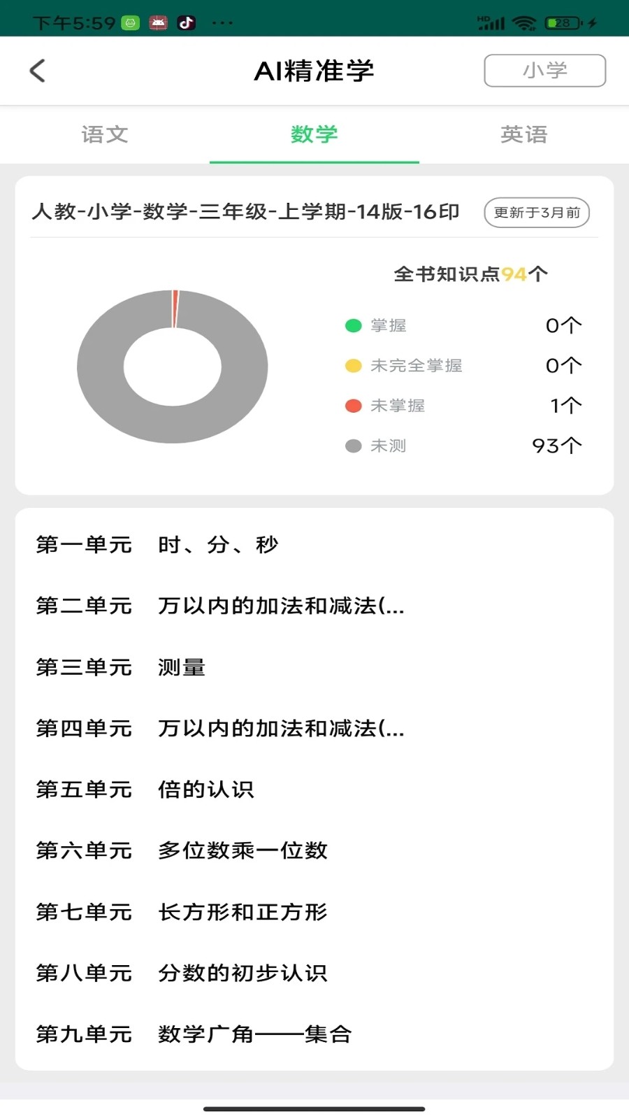 3、从上往下依次是语文 数学 英语 ,点击课本后面的去布置,选择小朋友今天学习的进度去布置即可。