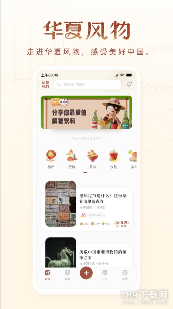 【华夏风物 App】是发现中国各地美好风物的互动平台,在这里,你可以找到当地地道的特产美食,风景独好的旅行景点,以及具有文化历史传承意义的非物质文化遗产,让你了解根植于城市脚下的特色风土之美;还可以通过文章、评论,分享你在探索各个地后的心得感受,与其他用户一起携手建立华夏的千面风貌,让更多人发现繁华多样的美好。