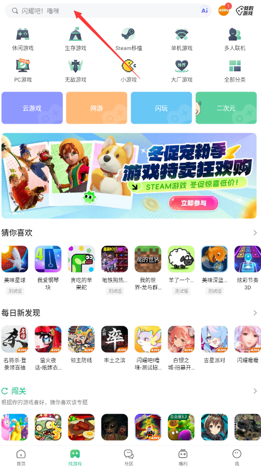 2.接着,在首页“找游戏”发现新内容。