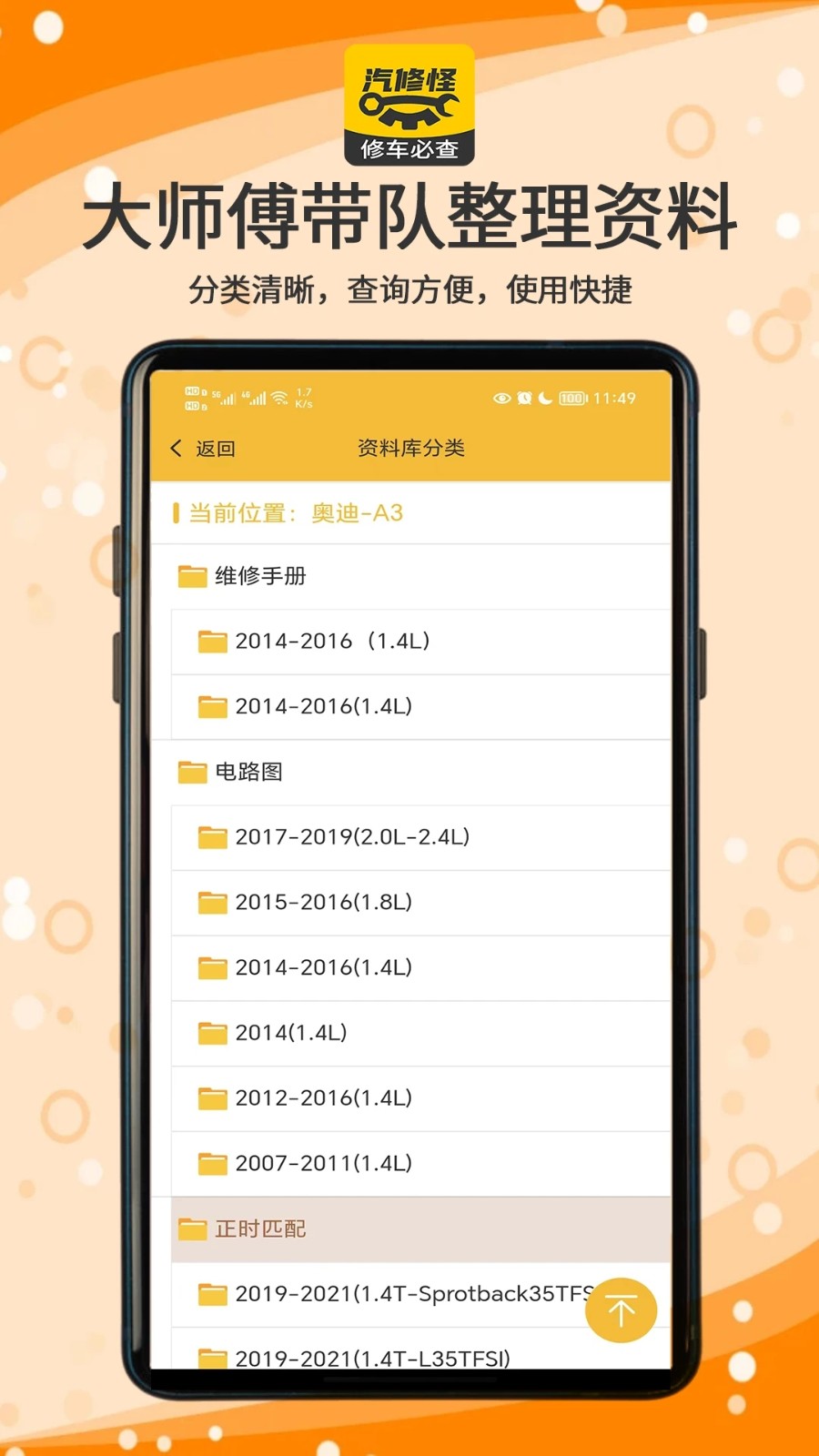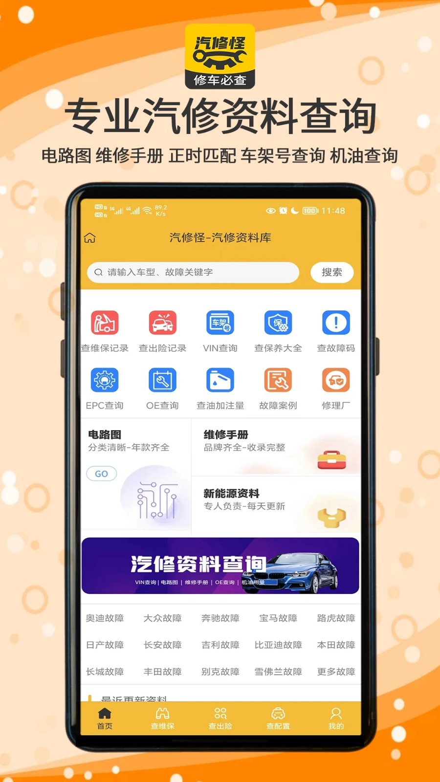 汽修怪APP是一款专业提供汽车维修相关资料、电路图、维修手册、修理厂、配件商、车架号、机油、原厂配置、OEM、维保记录、