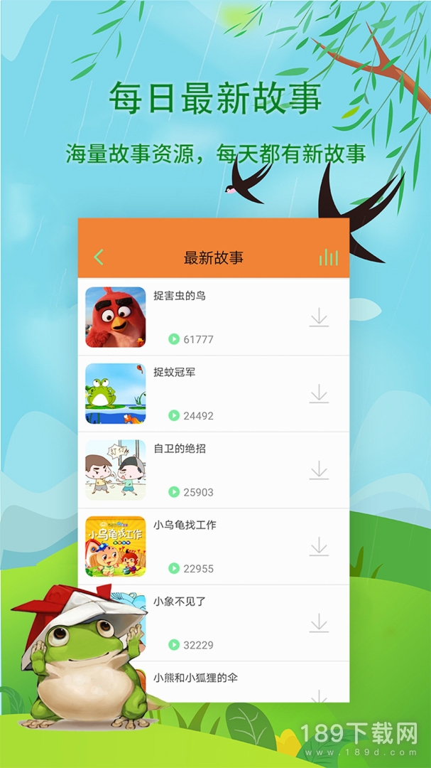 3、宝宝听故事下载,用各种或有趣或有寓意的故事来打开宝宝思维的大门,宝宝听故事还有生动的英语课程和儿歌资源,更多功能下载了解