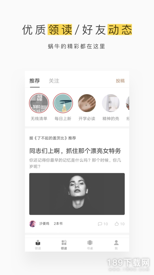 《网易蜗牛读书》是一款在线电子阅读小说app,软件还是网易一贯严谨负责的态度,只为了把最好的用户体验带给用户,追求极致的阅读享受,有兴趣的话赶紧下载体验吧!欢迎大家在189下载网下载网易蜗牛读书