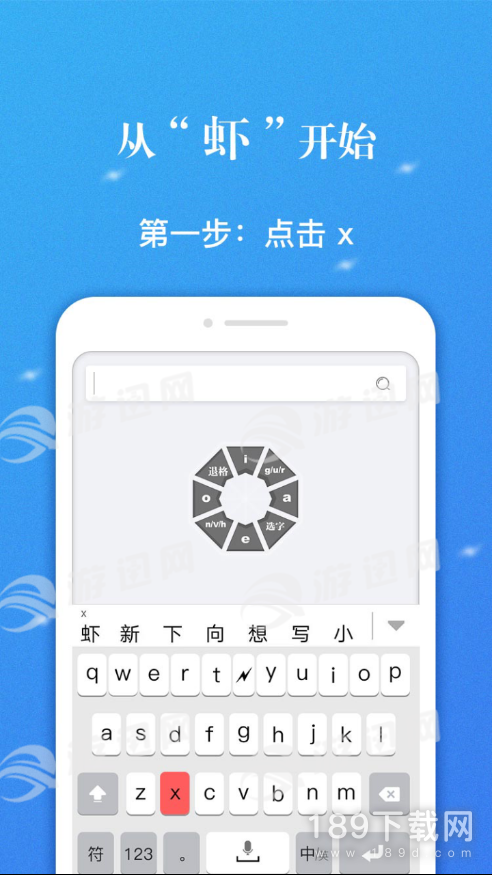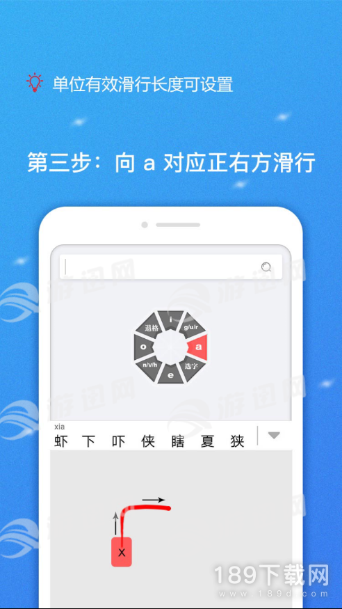 第一步,输入字母序列“xia”后,向右下方滑行,进入选字状态;