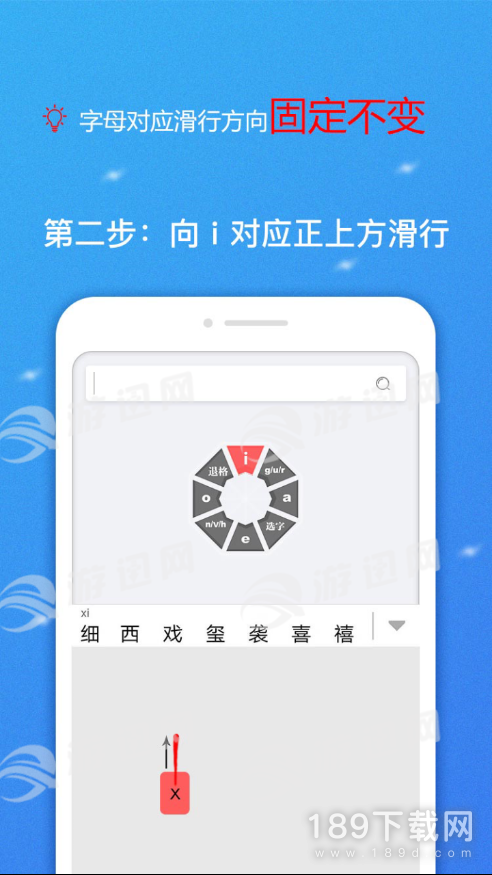 第二步,找到指示图中字母“i”所在方位,并沿此方向滑动有效距离,完成字母i输入;