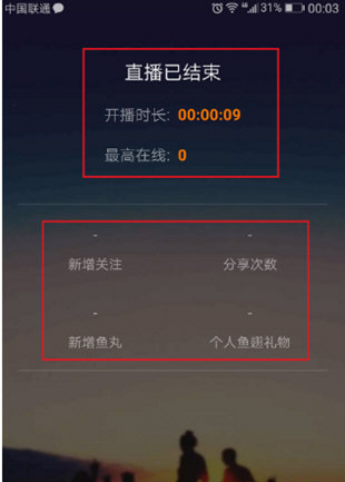 6、我们可以看到直播的时长,观看人数、礼物、新增关注等,如下图所示:
