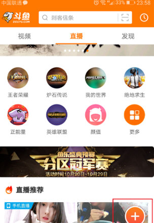 1、在手机上打开斗鱼APP,进去首页,点击右侧的“+”,如下图所示,