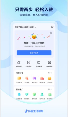 【抖音来客】是抖音本地生活商家的服务平台,入驻后可实现管理门店信息、上架团购、营销推广、经营结算等全流程功能。