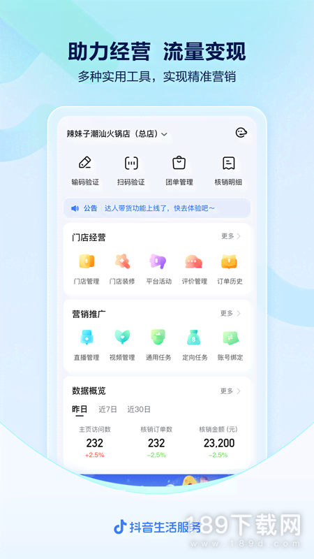 5、抖音来客专门为想做抖音推广的小伙伴准备的一款非常不错的官方app软件,帮助你更加舒服开启自己的同城推广之旅,更加好的查询自己的数据和管理自己的推广渠道,给你带来最棒的体验,相信不少的用户都会喜欢