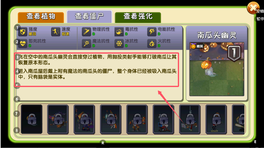 4、无论查看僵尸还是强化道具,界面布局都遵循左侧列表选择、右侧详细展示的原则。已收集的项目可自由查看,未收集的则会呈现锁定状态,鼓励探索以完成收集。