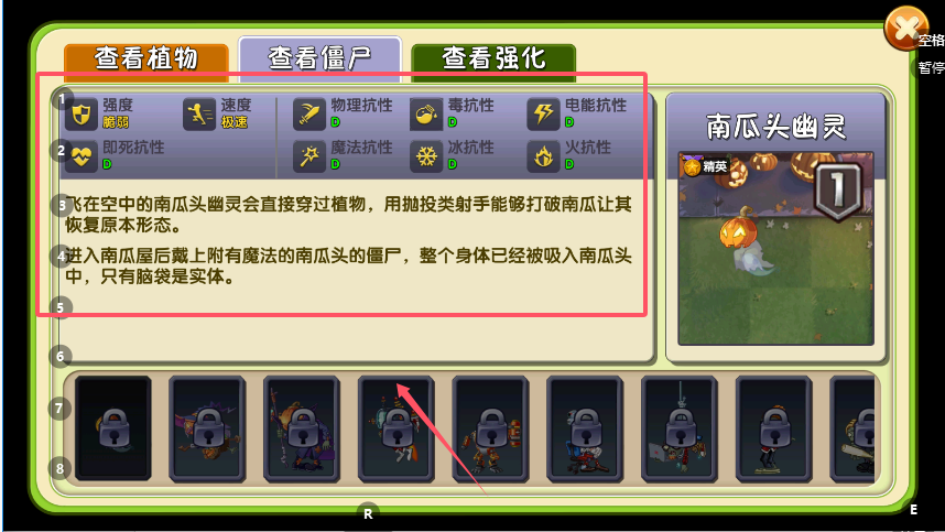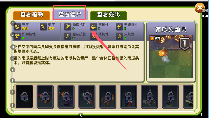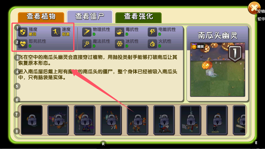 1、在游戏主界面点击进入“图鉴”系统,页面顶部会有“查看植物”、“查看僵尸”和“查看强化”三个选项卡。选择“查看强化”标签后,便能浏览所有可用的游戏内强化道具。